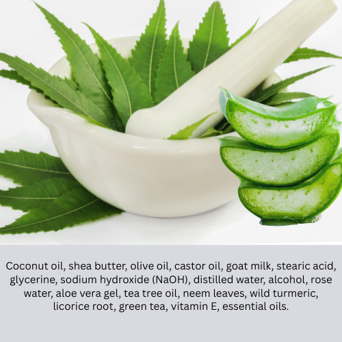 Crafted with a blend of coconut oil, shea butter, olive oil, castor oil, goat milk, glycerin, and essential oils, it not only cleanses but also deeply nourishes the skin. Neem leaves and tea tree oil work as powerful antibacterial agents, while aloe vera gel and vitamin E calm irritation, hydrate, and protect the skin barrier.